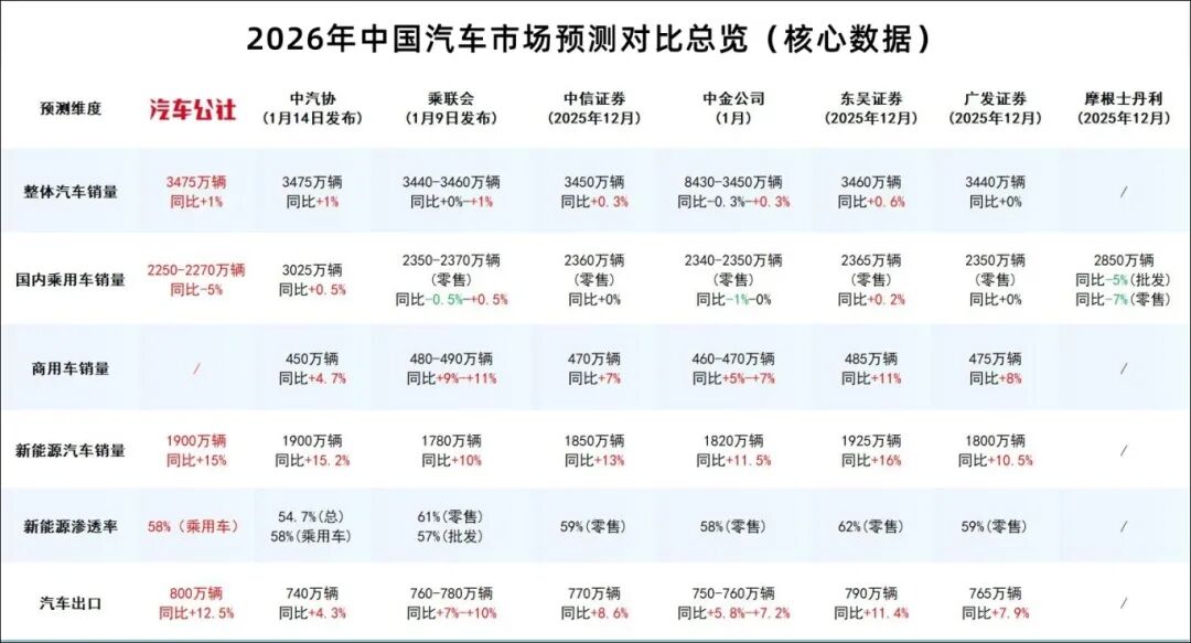 从国内的官方机构到国外的权威研究机构都为2026年的车市可能下跌做好了足够铺垫。最乐观的乘联会也只是小心翼翼地框定2026年车市1%的增幅,而最糟糕的预测值断言中国车市将在2026年跌去7%。绝大多数预测值都放在下跌3%~5%的负增长区间内。