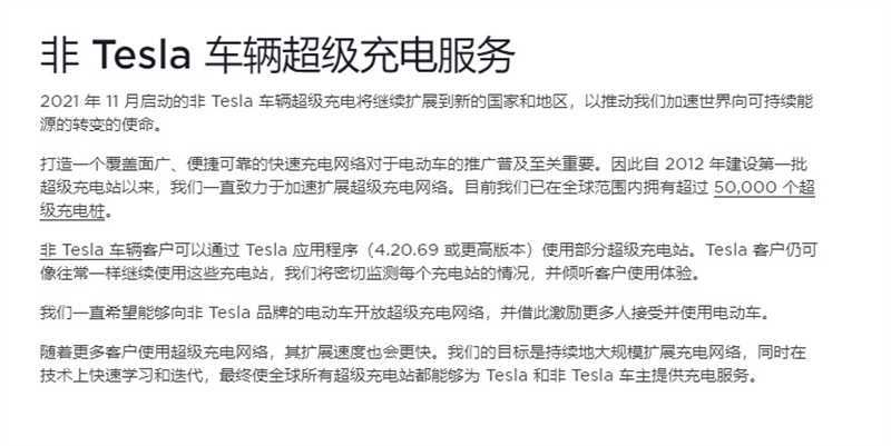 特斯拉充电网络也于2023年11月底开放。非Tesla车辆可以使用特斯拉充电网络。但特斯拉也表示:相比非Tesla车主,Tesla可以享受优惠的超级充电费用。