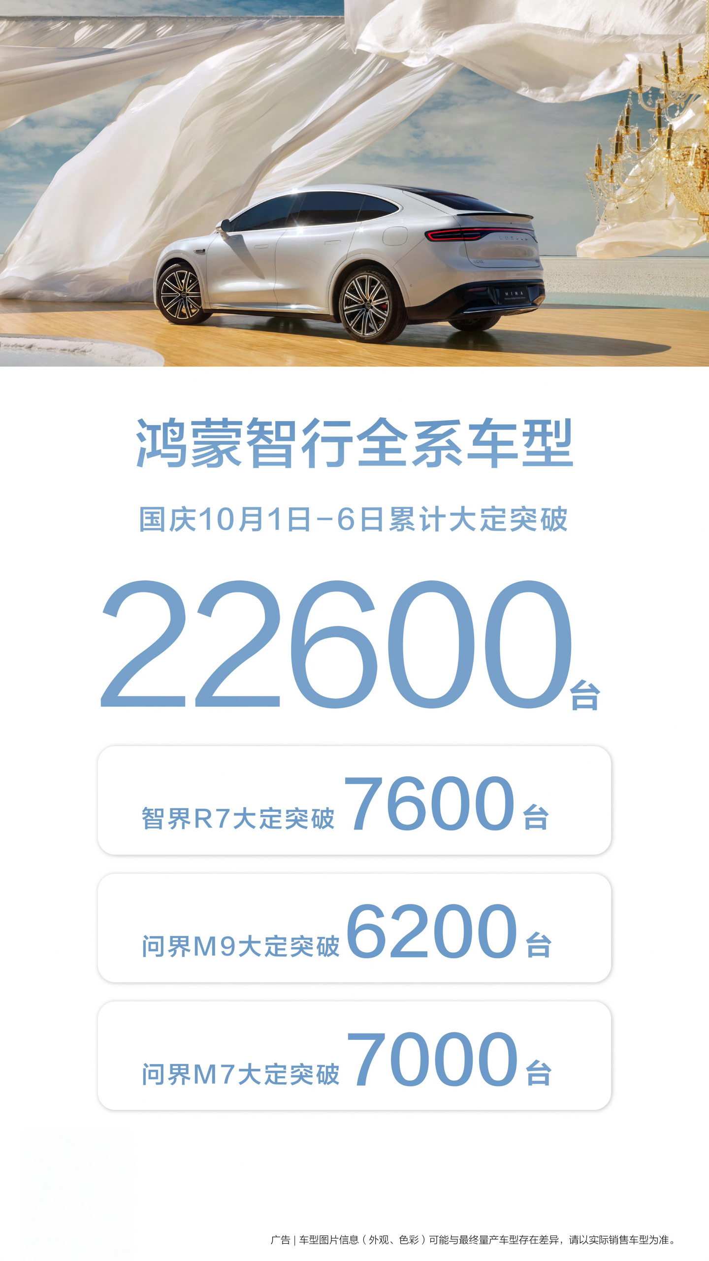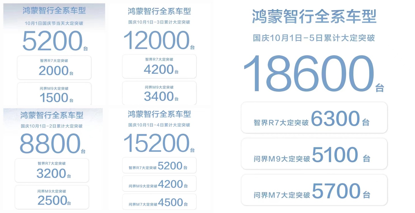 10 月 5 日大定 3400 台,智界 R7 大定 900 台,问界 M9 大定 900 台,问界 M7 大定 1200 台