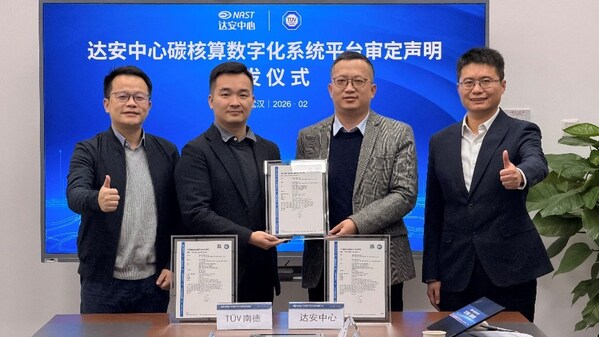 武汉2026年2月11日 /美通社/ -- 2月6日,TÜV南德意志集团(以下简称"TÜV南德")向襄阳达安汽车检测中心有限公司(以下简称"达安中心")颁发碳核算数字化系统平台审定声明。TÜV南德依据ISO 14064-3:2019对该平台中的"企业碳排放"、"产品碳足迹"及"电池产品碳足迹"三大核心模块进行审定,确认其分别符合ISO 14064-1:2018、ISO 14067:2018、GB/T 24067-2024等国内外主流标准,及欧盟电池法规相关草案授权法规文件 (EU) Document Ares (2024) 3131389等合规要点。此举标志着达安中心具备了国际认可且满足出口合规的全链路碳管理数字化平台,将进一步助力汽车产业链高效应对碳合规。