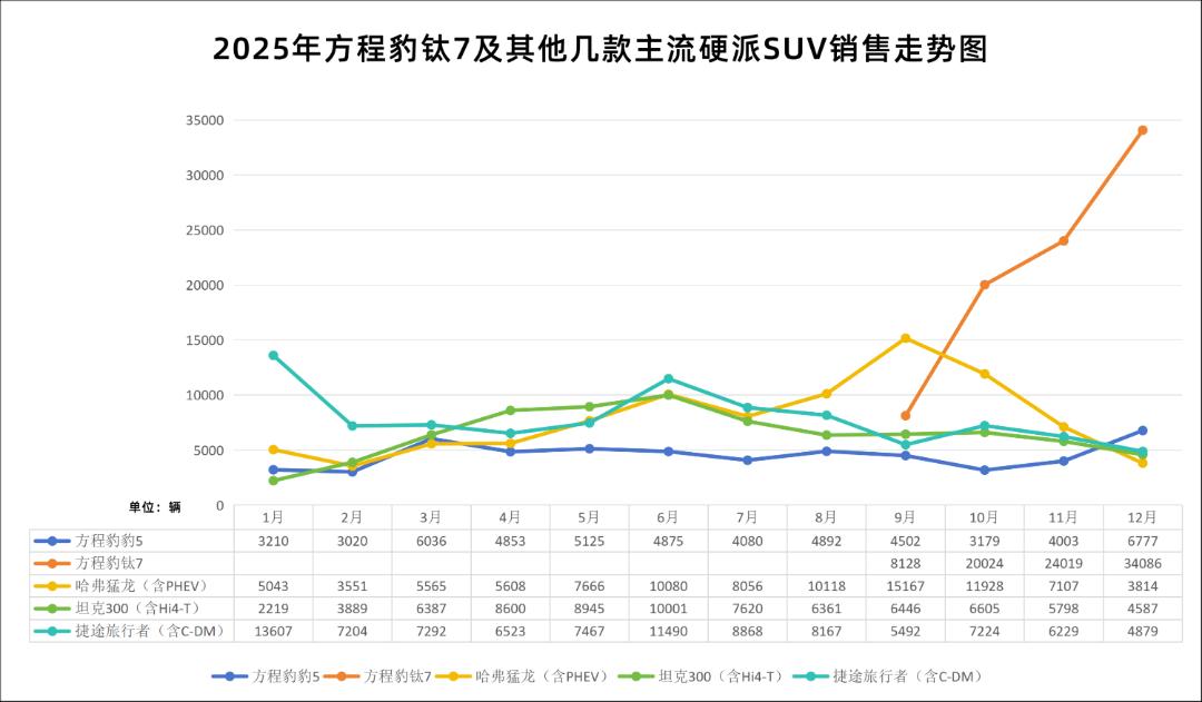 “当初没想到月销量能到这么多!”去年12月30日下午3点,刚刚从零下30多度的内蒙古风尘仆仆地赶回深圳的比亚迪方程豹总经理熊甜波对《汽车公社》说,12月份,方程豹钛7以月销3.4万辆收官2025年,以一己之力结束长城汽车和奇瑞汽车对“方盒子”的统治,也使得今年即将加入这一战场的吉利汽车也倒吸一口凉气。