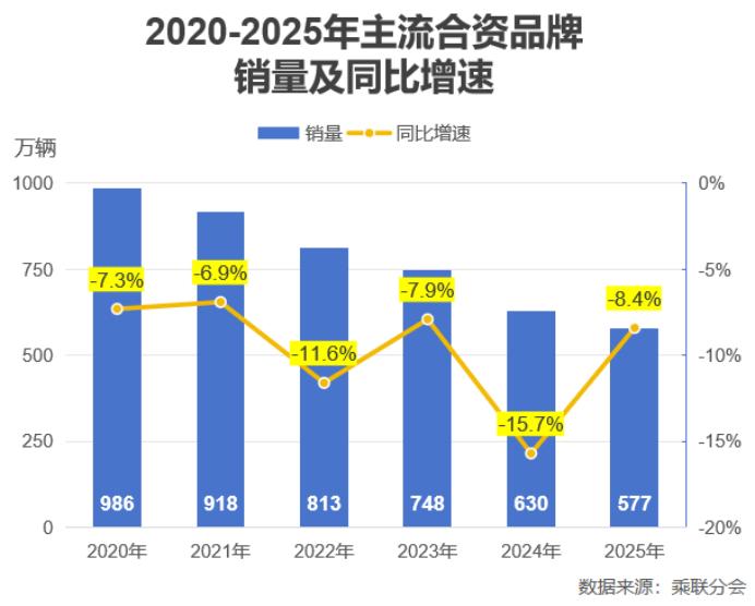 乘联分会的数据显示,2025年主流合资品牌累计销量为577万辆,在乘用车市场的份额已经从2020年的51%跌到了24%。