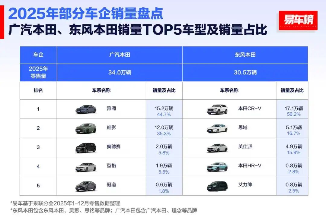 就拿本田来说,广汽本田目前80%的销量由雅阁和皓影支撑,东风本田超70%的销量来自CR-V和思域。2025年,两家企业的销量跌幅分别达到了26.7%和27.9%。