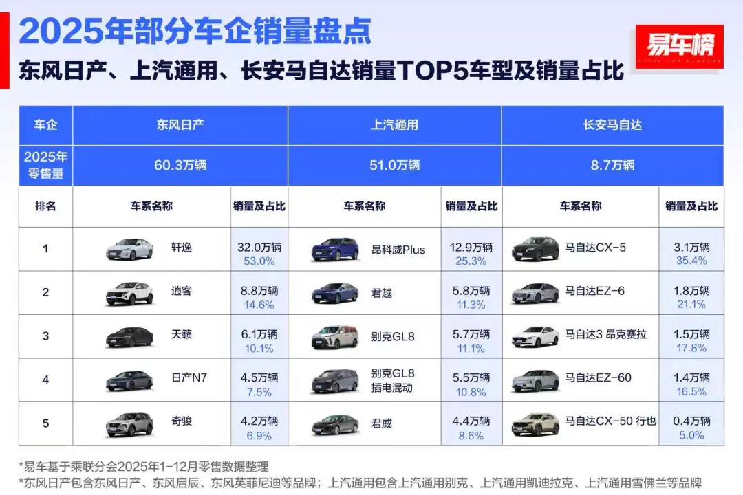 对于一些小体量的合资车企来说,这一点回报甚至足以扭转过去几年的势头。比如长安马自达,虽然在市场上存在感一般,但易车榜数据显示,2025年,其国内累计零售销量为8.7万辆,同比增长15.2%,其月度新能源渗透率曾一度超60%。