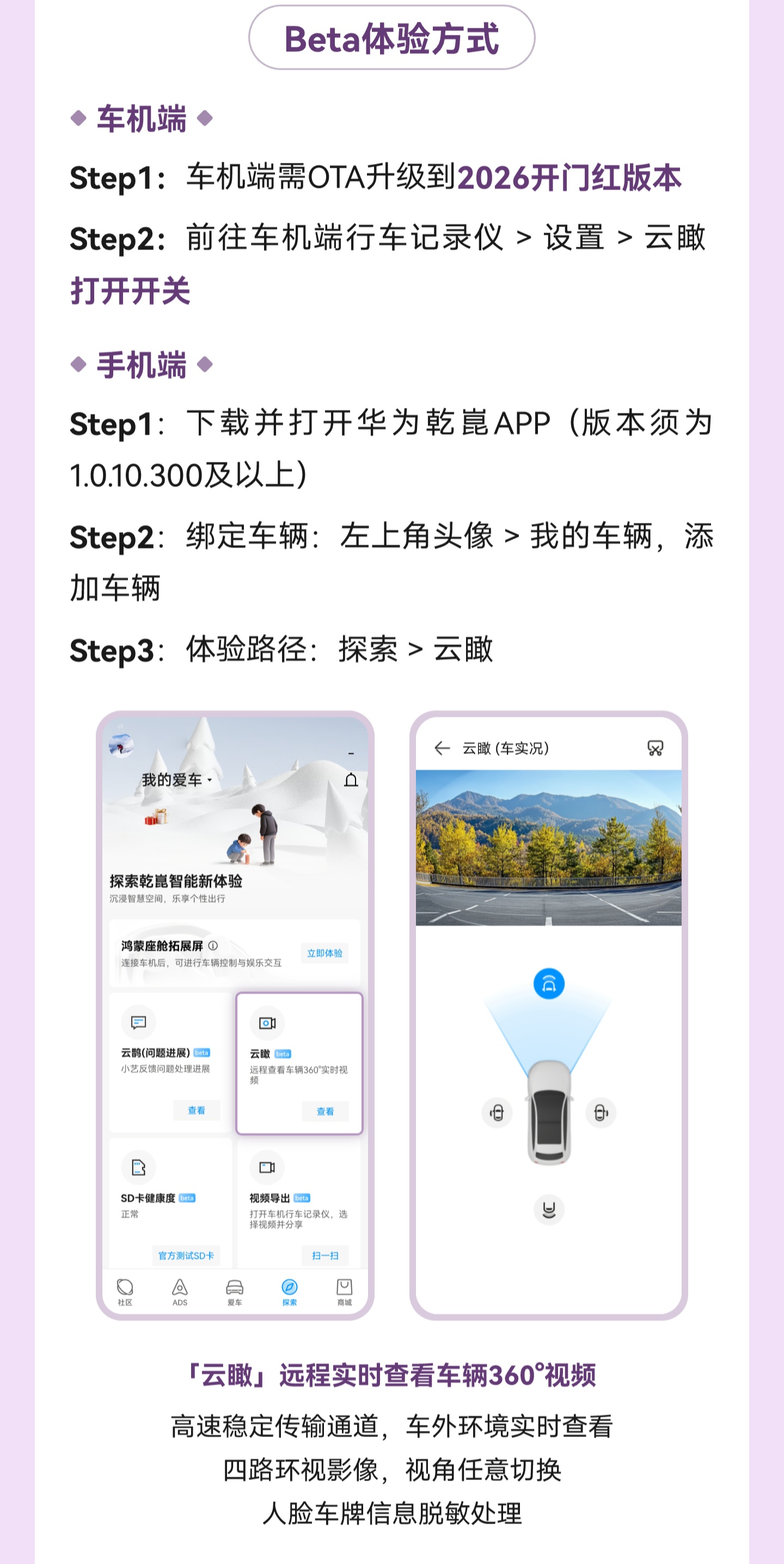 IT之家 2 月 11 日消息,华为乾崑云瞰功能今日开启 Beta 测试(活动时间 2026 年 2 月 11 日-3 月 10 日),可以让用户远程实时查看车辆 360° 视频。