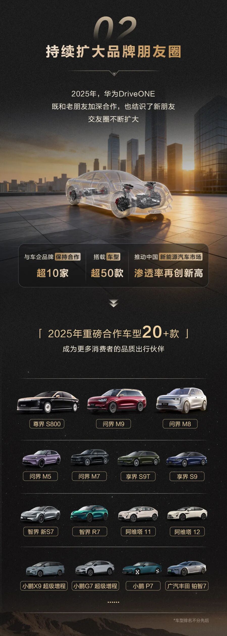 IT之家从华为数字能源获悉,华为 DriveONE 与车企品牌保持合作超 10 家、搭载车型超 50 款,2025 年重磅合作车型 20+ 款,包括鸿蒙智行尊界 S800、问界 M9 / M8 / M7 / M5、享界 S9T / S9、智界新 S7 / R7,以及阿维塔 11 / 12、小鹏 X9 超级增程 / G7 超级增程 / P7、广汽丰田铂智 7 等。