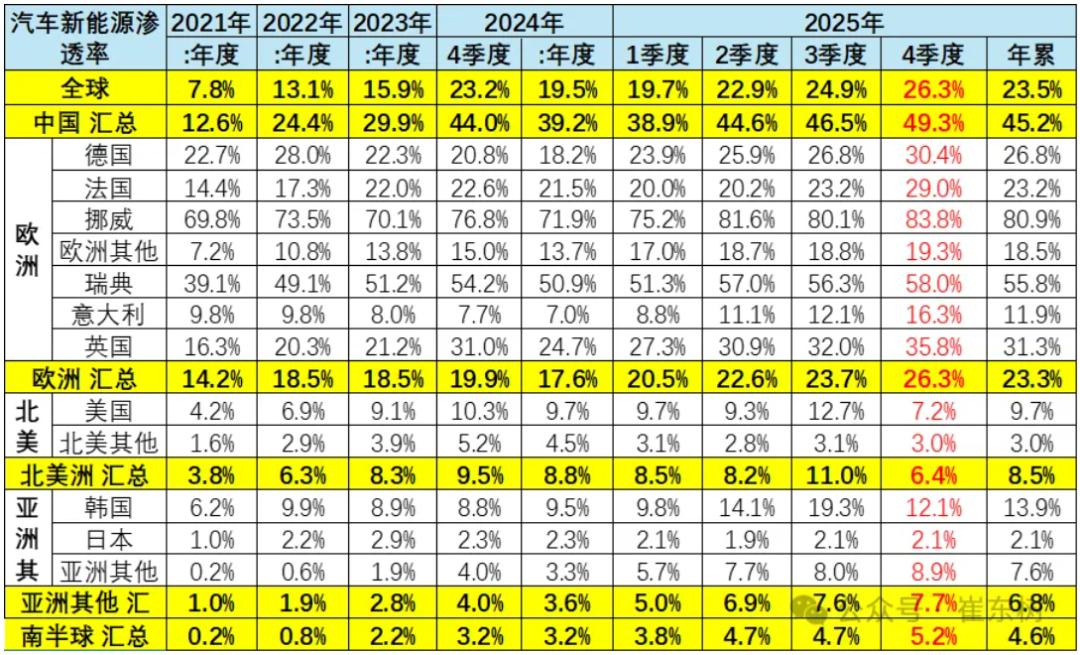 从全球渗透率来看,2024年全球新能源汽车渗透率为19.5%,2025年提升至23.5%,中国渗透率达45.2%,德国26.8%,挪威80.9%,但美国仅9.7%、日本仅2.1%,全球新能源汽车发展仍存在较大不均衡性,需求增长空间依然广阔。
