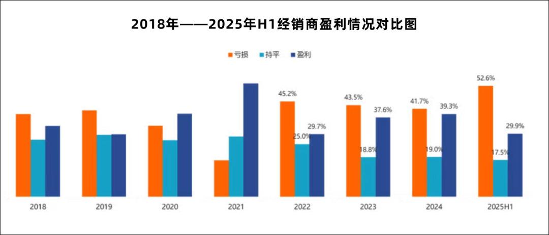 首当其冲是经销商。2025年中国汽车经销商行业迎来近八年最严峻的亏损潮,数据显示:上半年经销商亏损比例达52.6%,较2024年扩大了10.9个百分点;仅29.9%实现盈利。前三季度亏损率进一步攀升至55%,全年预计超58%经销商亏损,约2000家4S店退网离场。