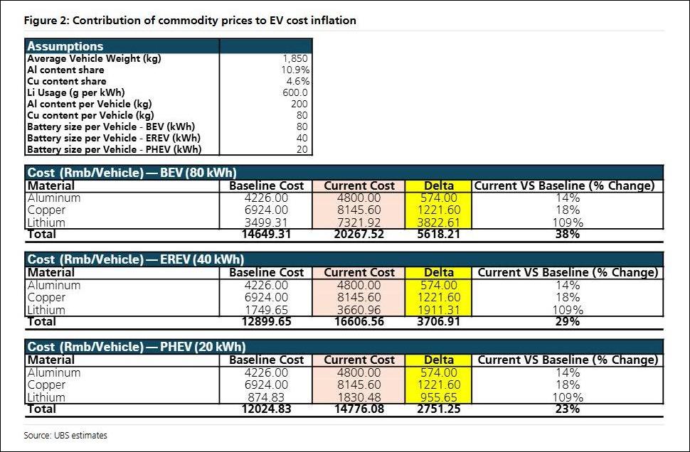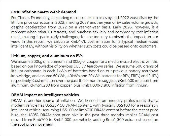1月26日,瑞银(UBS)发布题为《中国汽车行业:测算金属与DRAM价格上涨对电动汽车的成本冲击》的研究报告,报告测算一台典型中型智能电动汽车的制造成本将在短期内激增4000至7000元人民币。