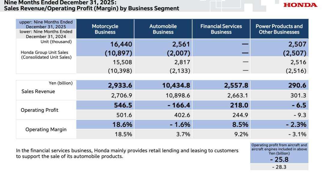 而且两轮业务和四轮业务利润贡献严重失衡,特别是后者,已然成为本田“赤字体质”的主要根源。自2026财年第一季度本田的汽车业务由盈转亏后,已经是连续3个季度亏损。