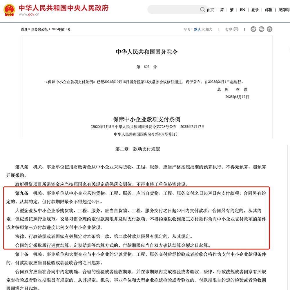 ▲国务院《保障中小企业款项支付条例》