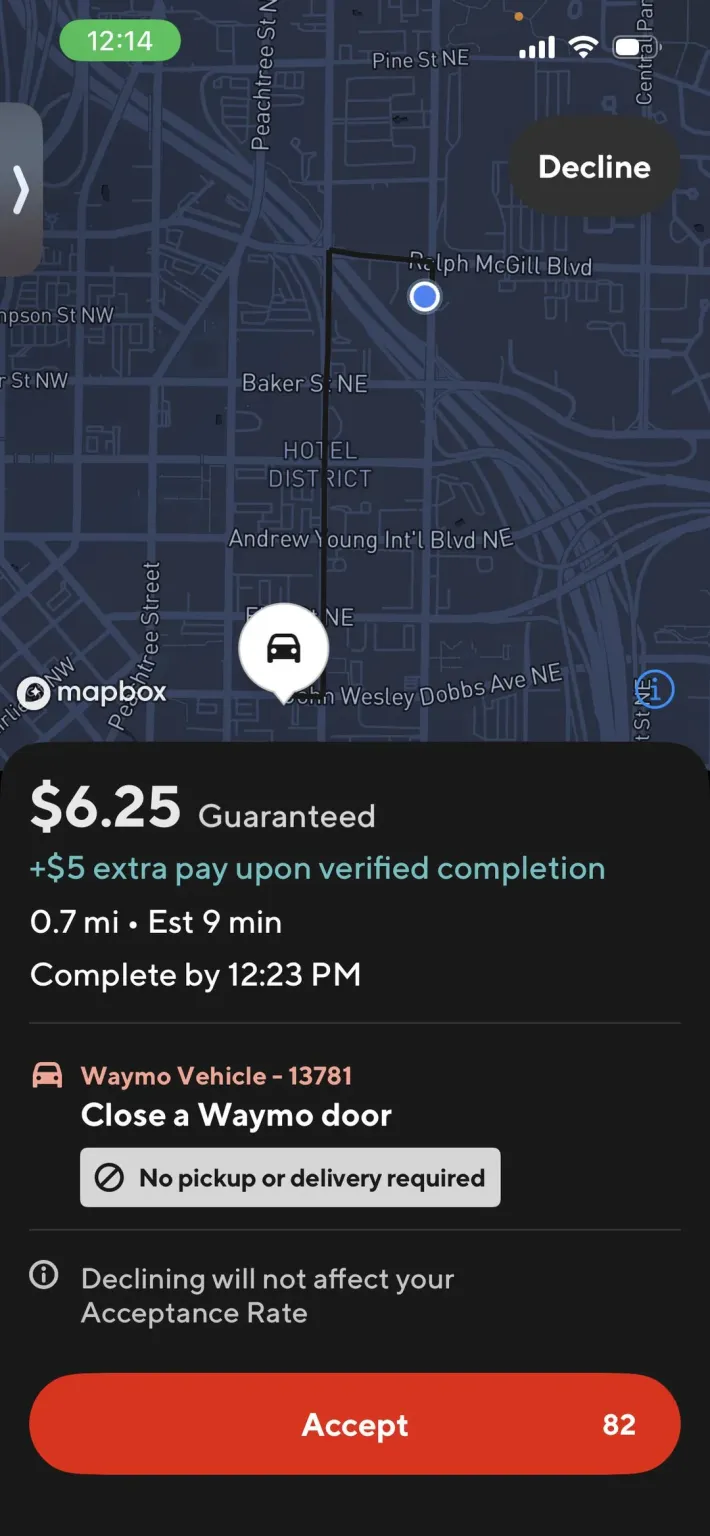 一名 DoorDash 司机在 Reddit 发帖称,自己接到一项特殊任务 —— 不是送餐,而是获得 6.25 美元报酬,去不到 2 公里的地方关闭一辆 Waymo 的车门,完成验证后还能再拿 5 美元。