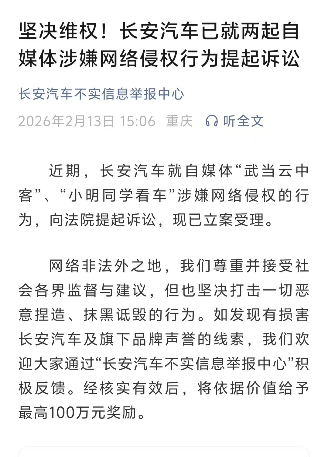 凤凰网科技讯 2月13日,长安汽车不实信息举报中心发文称,近期,长安汽车就自媒体“武当云中客”、“小明同学看车”涉嫌网络侵权的行为,向法院提起诉讼,现已立案受理。