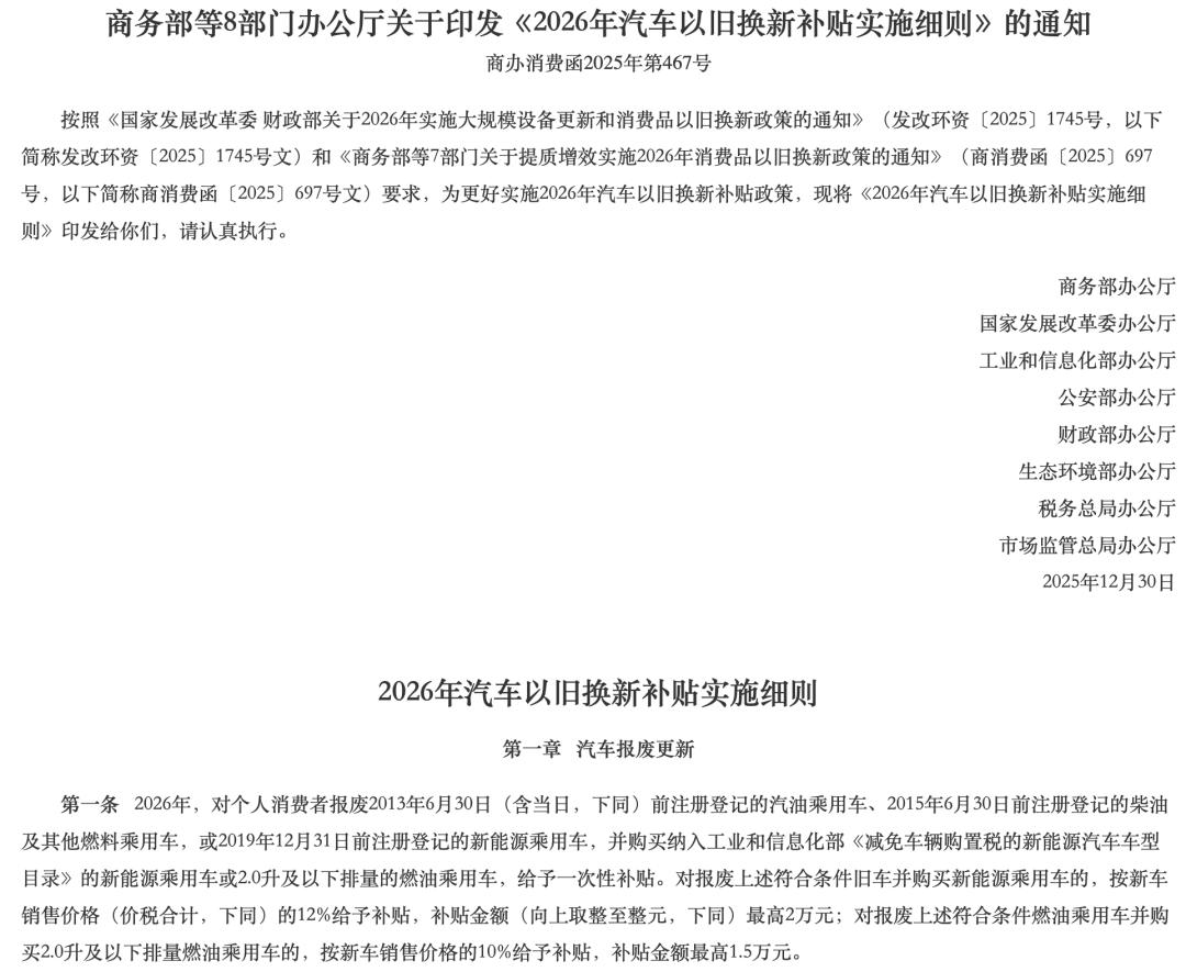 图/《2026年汽车以旧换新补贴实施细则》部分内容 来源/互联网 新能源观截图