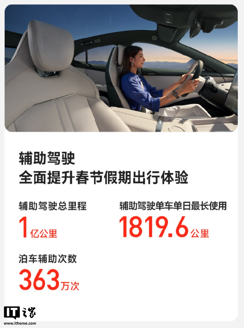 IT之家 2 月 25 日消息,“小米汽车”官方微博现已公布 2026 年春节假期小米汽车出行报告,累计行驶里程超 4.05 亿公里、辅助驾驶总里程 1 亿公里。