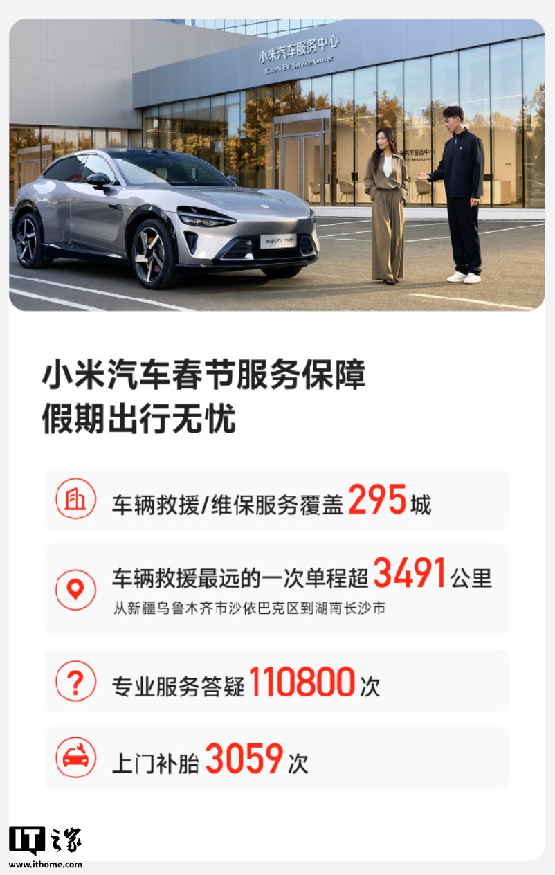 服务保障方面,春节期间小米汽车车辆救援最远的一次单程达 3491 公里(从新疆乌鲁木齐市沙依巴克区到湖南长沙市),专业服务答疑 110800 次,上门补胎 3059 次。