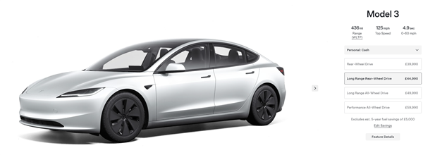 英国售价44,990英镑(约为人民币41.49万元),比标准续航后轮版高出5,000英镑,新车将于11月开启交付。