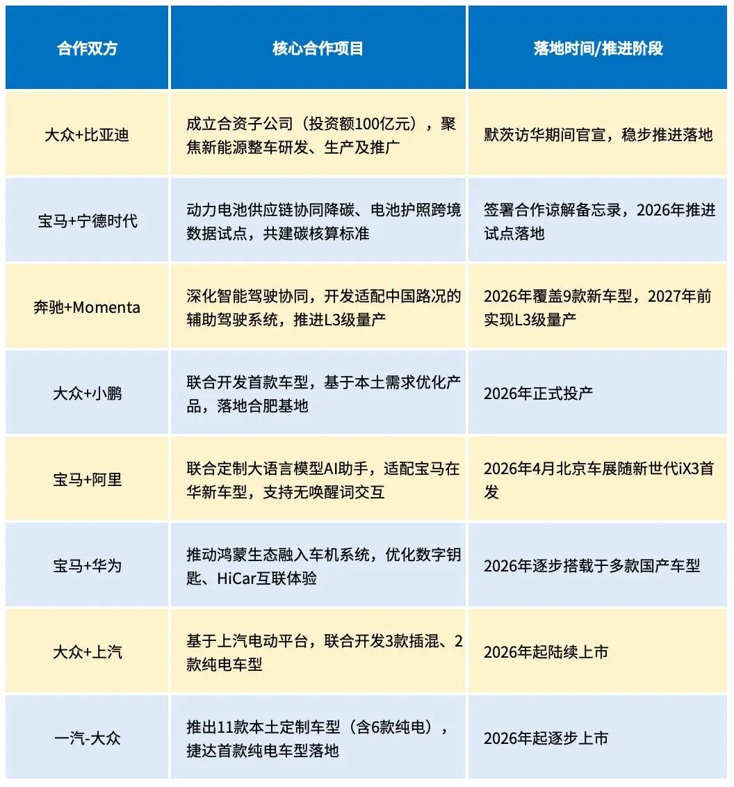 3. 企业官方信息:宝马集团2026年在华布局及新世代车型相关发布;梅赛德斯-奔驰智能驾驶合作及新车型落地计划;大众汽车与比亚迪合资项目官宣信息(2026年2月默茨访华期间);一汽-大众、大众与小鹏合作项目相关披露;上汽集团官网大众与上汽新能源技术合作相关公告(2024年6月27日发布)。