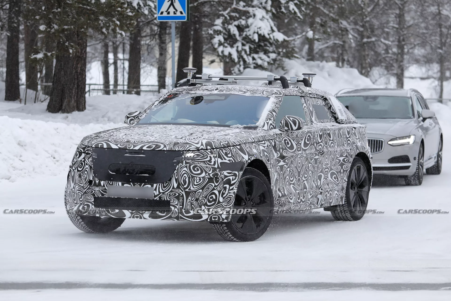 在设计细节方面,新车前脸依然保留了家族式的经典元素,配备了狭长倾斜的大灯组与大尺寸前格栅。测试车不仅展示了隐藏式门把手和车顶行李架,还在车顶配备了两个大型鲨鱼鳍天线以及居中布置的摄像头。