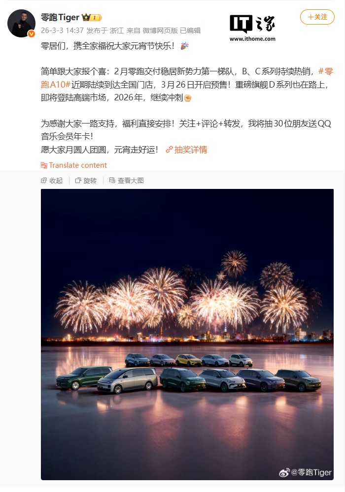 IT之家 3 月 3 日消息,零跑汽车 COO 徐军今日在微博宣布,旗下全新小型 SUV 车型零跑 A10 将于 3 月 26 日开启预售。据官方规划,该车预计在今年第一季度内完成上市。