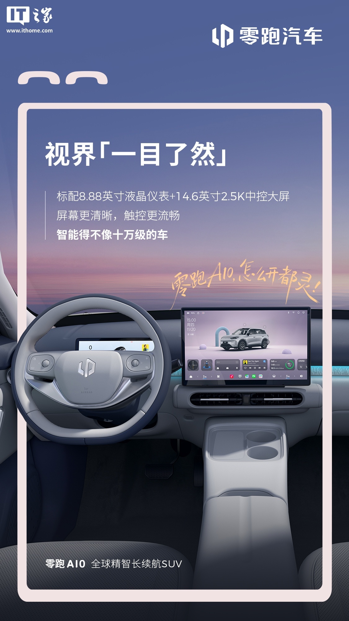座舱内部采用简洁的平直线条设计,标配双辐式多功能方向盘、8.88 英寸全液晶仪表以及 14.6 英寸 2.5K 分辨率悬浮式中控屏。此外,车辆还配备车内氛围灯、手机无线充电区域及双杯架等实用性配置。值得关注的是,零跑 A10 将接入通义千问 AI 大模型,搭载“超级小零”智能助手,进一步提升人机交互的自然度与智能化水平。