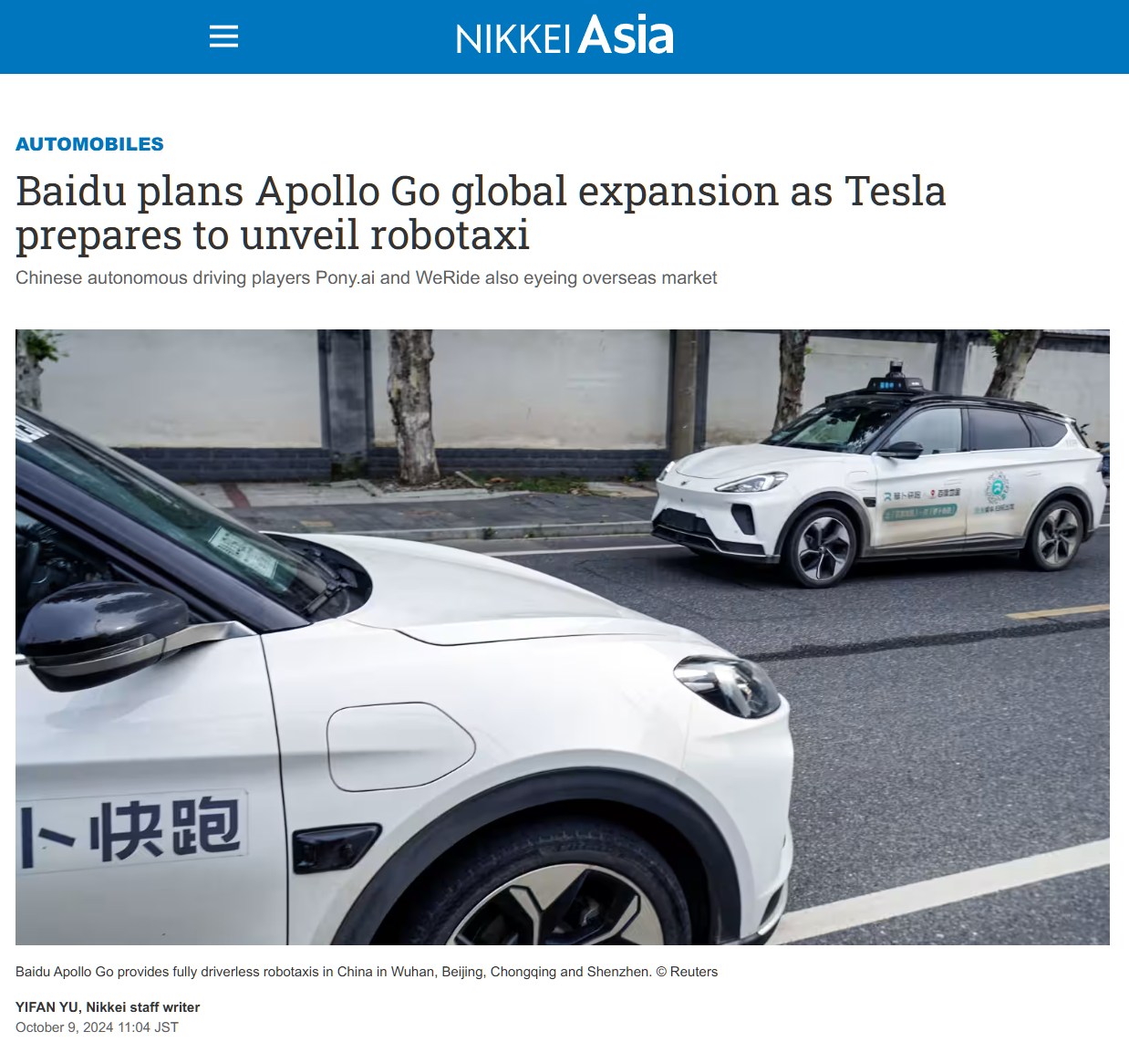 IT之家 10 月 9 日消息,据日经新闻今天上午报道,随着自动驾驶汽车商业化竞争的白热化,中国互联网巨头百度计划在中国以外的地区推出机器人出租车服务 Apollo Go。