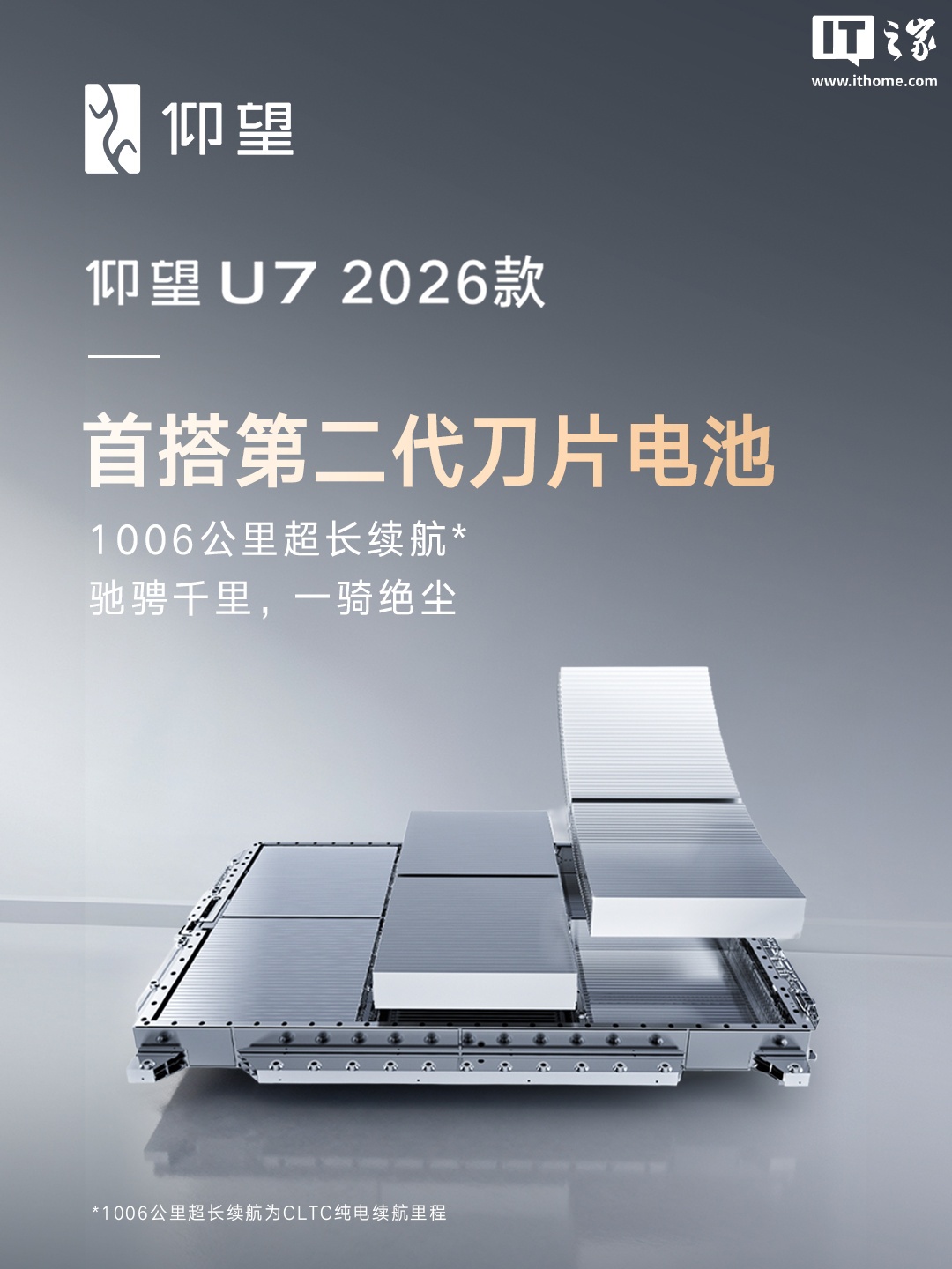 IT之家 3 月 4 日消息,比亚迪仰望汽车今日官宣,仰望 U7 2026 款将首搭第二代刀片电池,1006 公里超长纯电续航(CLTC)。
