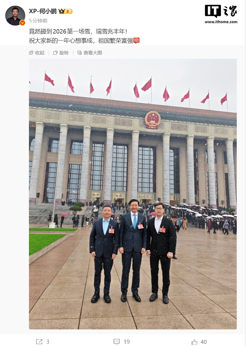 IT之家 3 月 4 日消息,小鹏汽车董事长何小鹏今日发布视频,表示作为全国人大代表参加 2026 年全国两会,和大家汇报一下这次带来的三条建议: