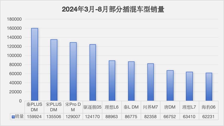 尽管入局者众多,但目前插混车型中的爆款产品基本都在比亚迪、理想汽车、问界这三家车企旗下。据懂车帝数据,2024年3月-8月,插混(含增程)车型销量前10名中,比亚迪占据7席,其余的三款是理想L6、问界M7、理想L7,分别为第5、7、9名。