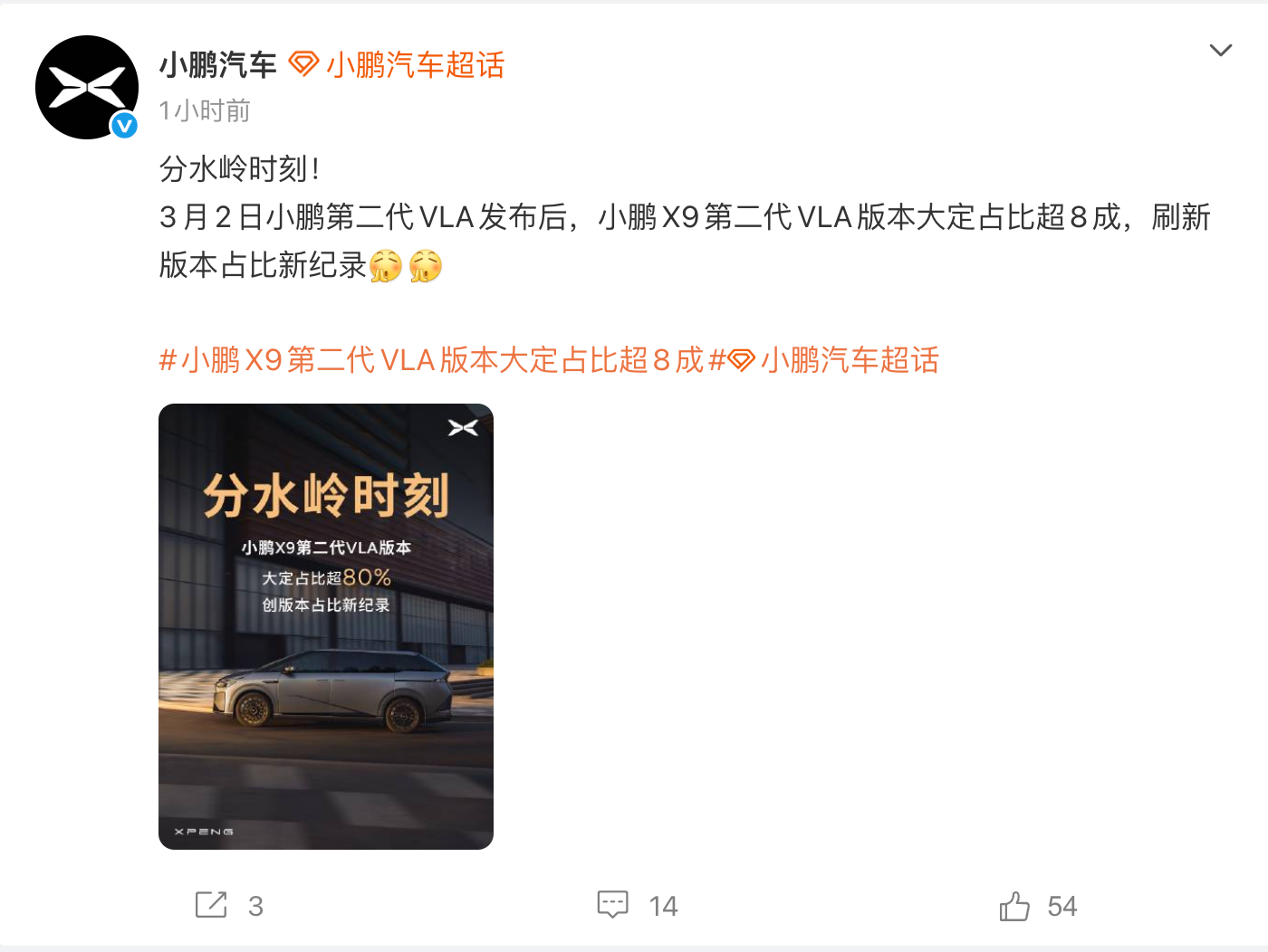 3月3日,小鹏汽车官方宣布,小鹏X9第二代VLA版本大定占比超8成,创版本占比新纪录。官方称之为“分水岭时刻”。