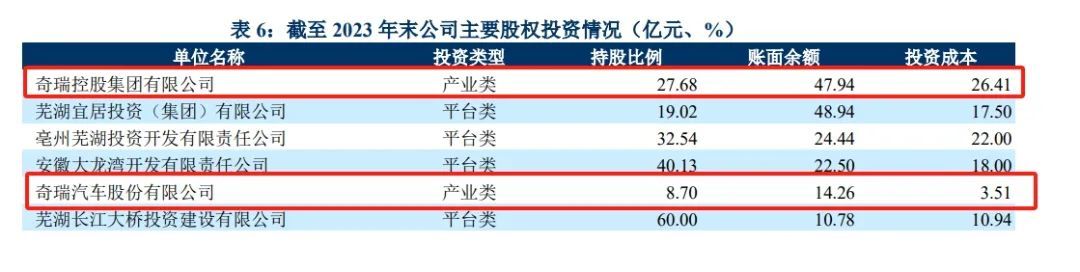 截至2023年末,芜湖建投对奇瑞控股和奇瑞汽车的股权投资账面余额分别为47.94亿元和14.26亿元,两者初始投资成本为26.41亿元和3.51亿元。