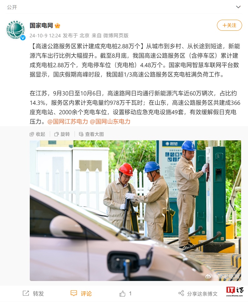IT之家 10 月 9 日消息,国家电网官微今天午间发文宣布,截至 8 月底,我国高速公路服务区(含停车区)累计建成充电桩 2.88 万个,充电停车位(充电枪)4.48 万个。