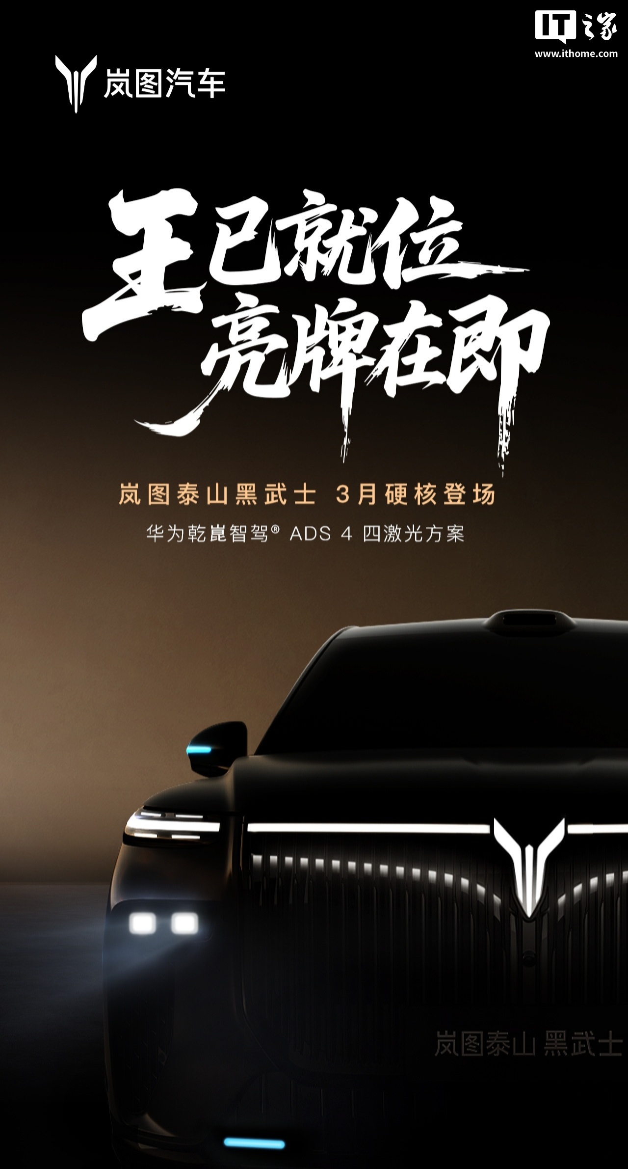 《中国首款量产 L3 级 SUV,岚图泰山黑武士官宣 3 月上市》