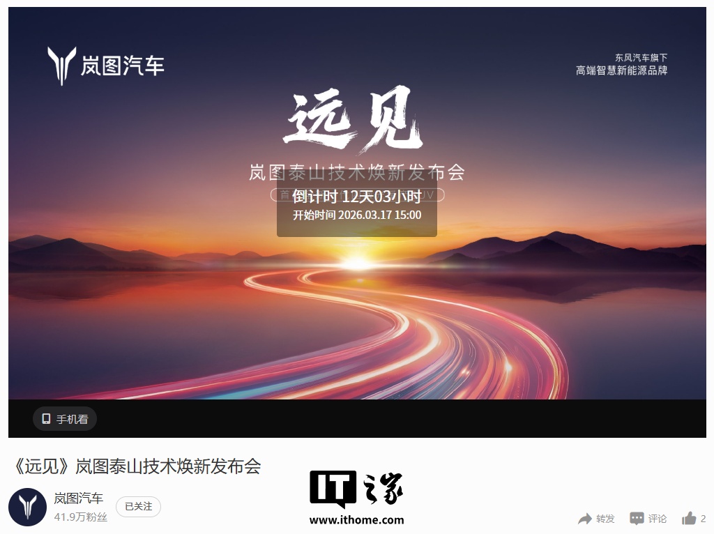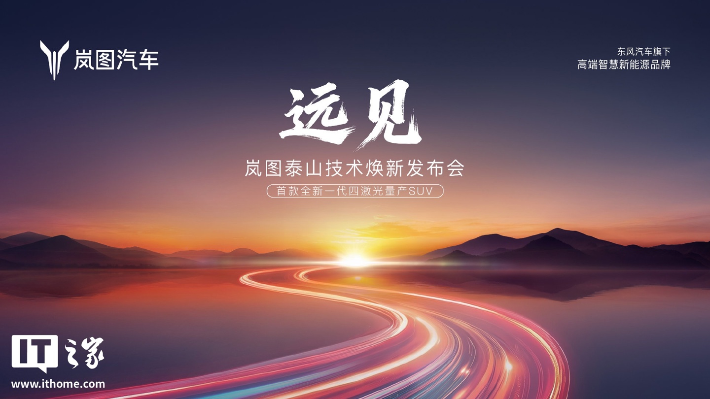 IT之家 3 月 5 日消息,岚图汽车官方今日在微博预设了岚图泰山技术焕新发布会 ——《远见》的直播,宣传图显示,岚图汽车将带来首款全新一代四激光量产 SUV。