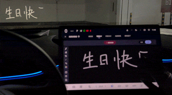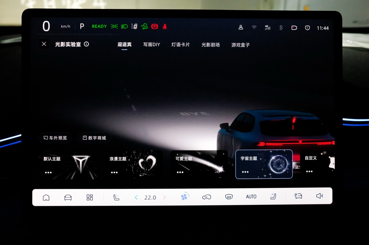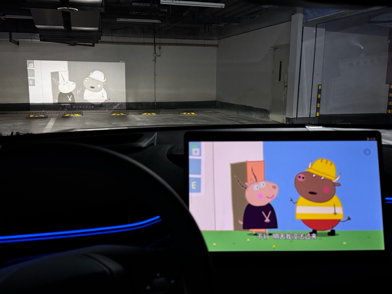 简单来说,可以理解为一个“车载投影仪”,投射的最高亮度可以达到 1200 lm,车机内预设了一些投射画面,可以设置为迎、送宾等效。