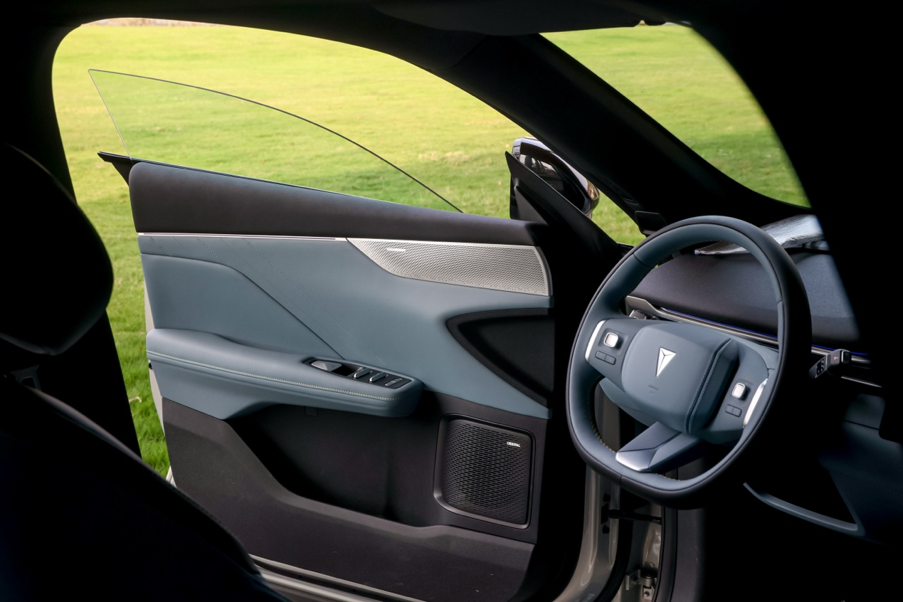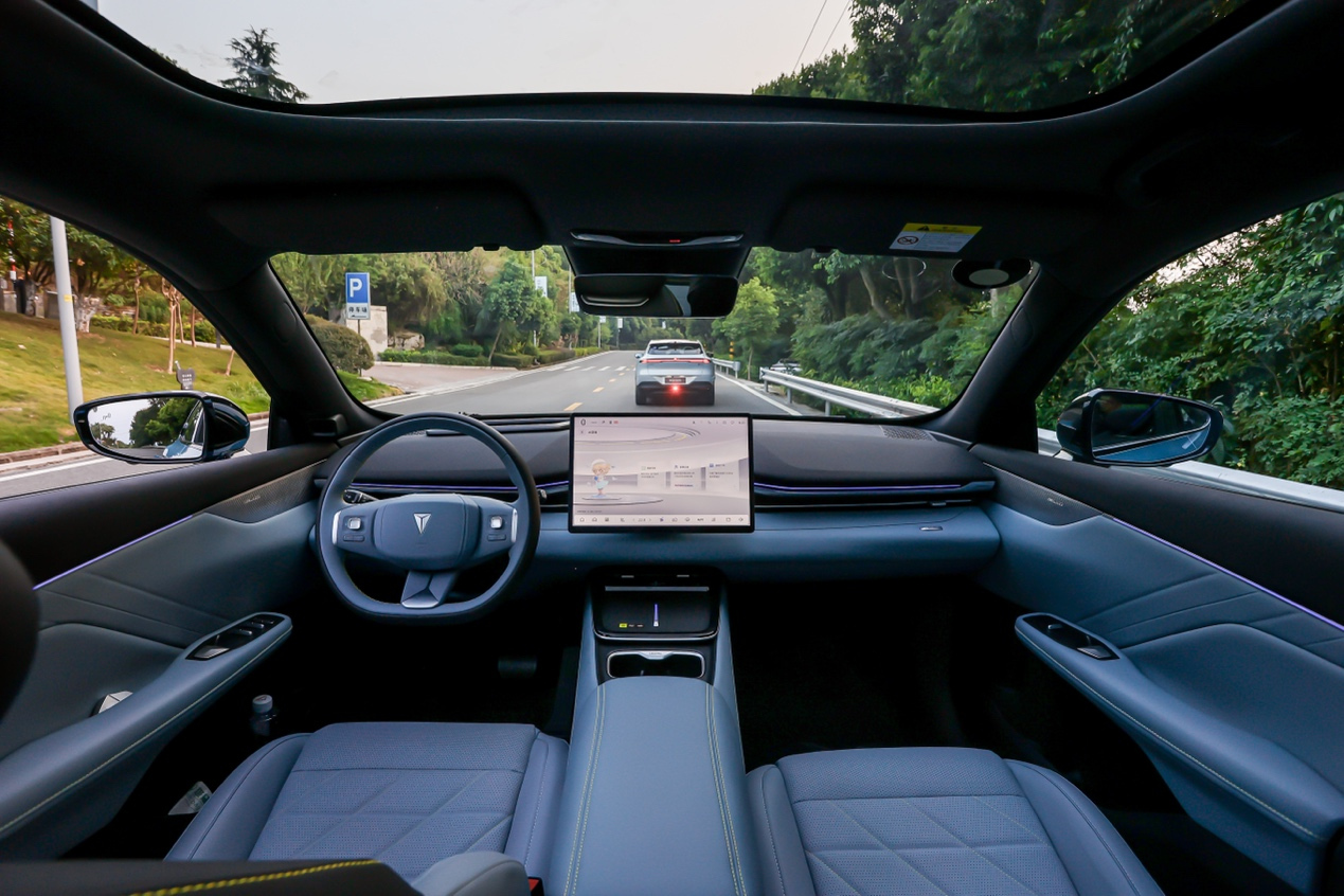 驾驶位采用了无仪表设计,配备了最高 12000nits 亮度的 AR-HUD,提供了包含小地图、歌词、电量 / 油量、蓝牙电话、辅助驾驶、AR 导航、简介导航等在内的丰富信息显示。
