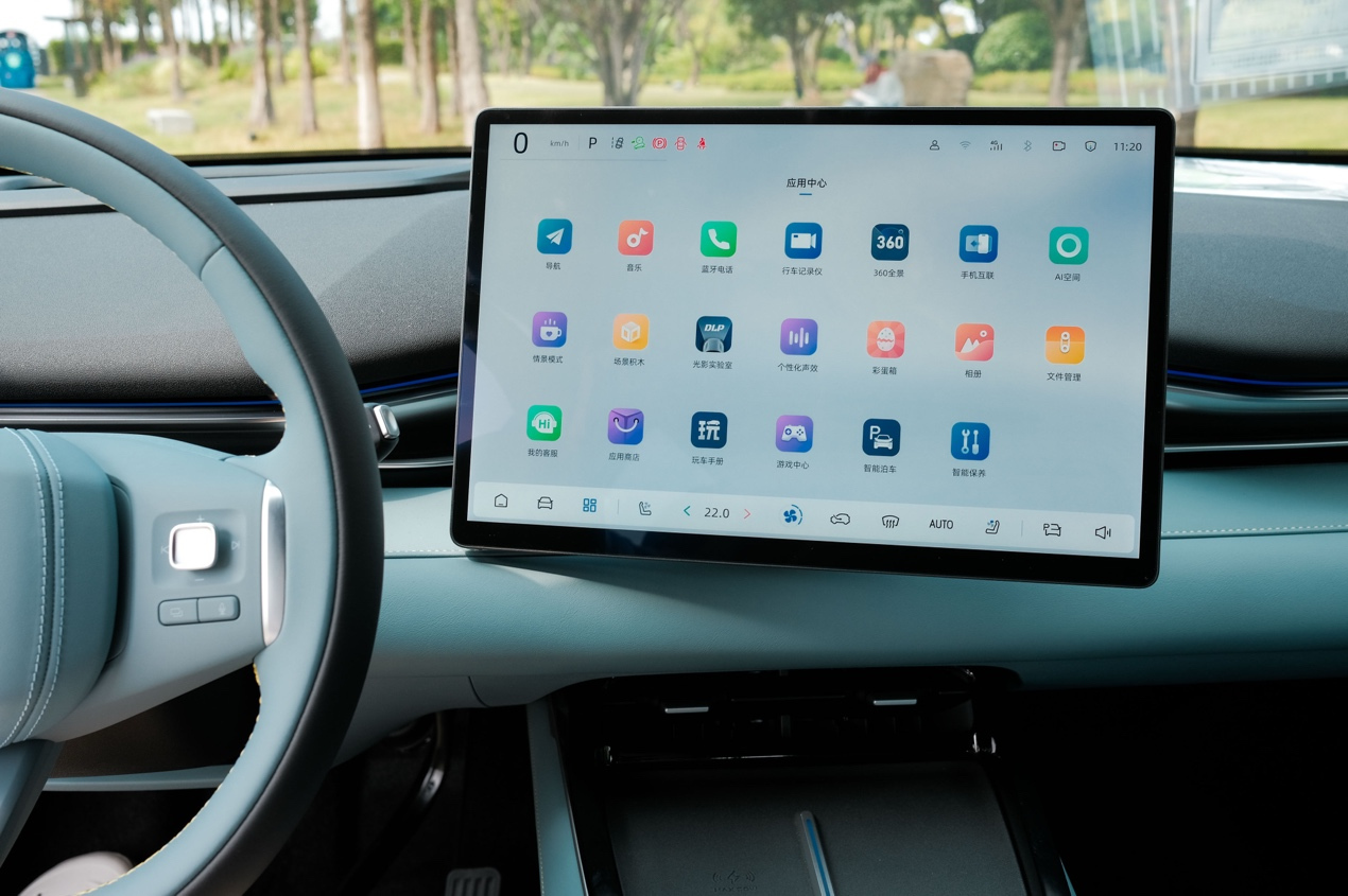中控部分搭载了 2.5K 分辨率的 15.4 英寸“向日葵”屏幕,为什么叫向日葵屏幕呢,因为在驾驶员上车前,中控屏幕是正对着后方的,