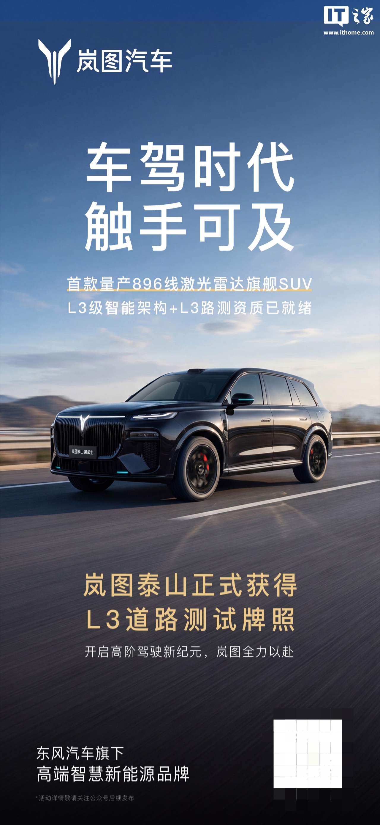 IT之家 3 月 6 日消息,岚图泰山技术焕新发布会 ——《远见》定档 3 月 17 日举行,首款量产华为 896 线旗舰 SUV —— 岚图泰山将迎来实车首秀。