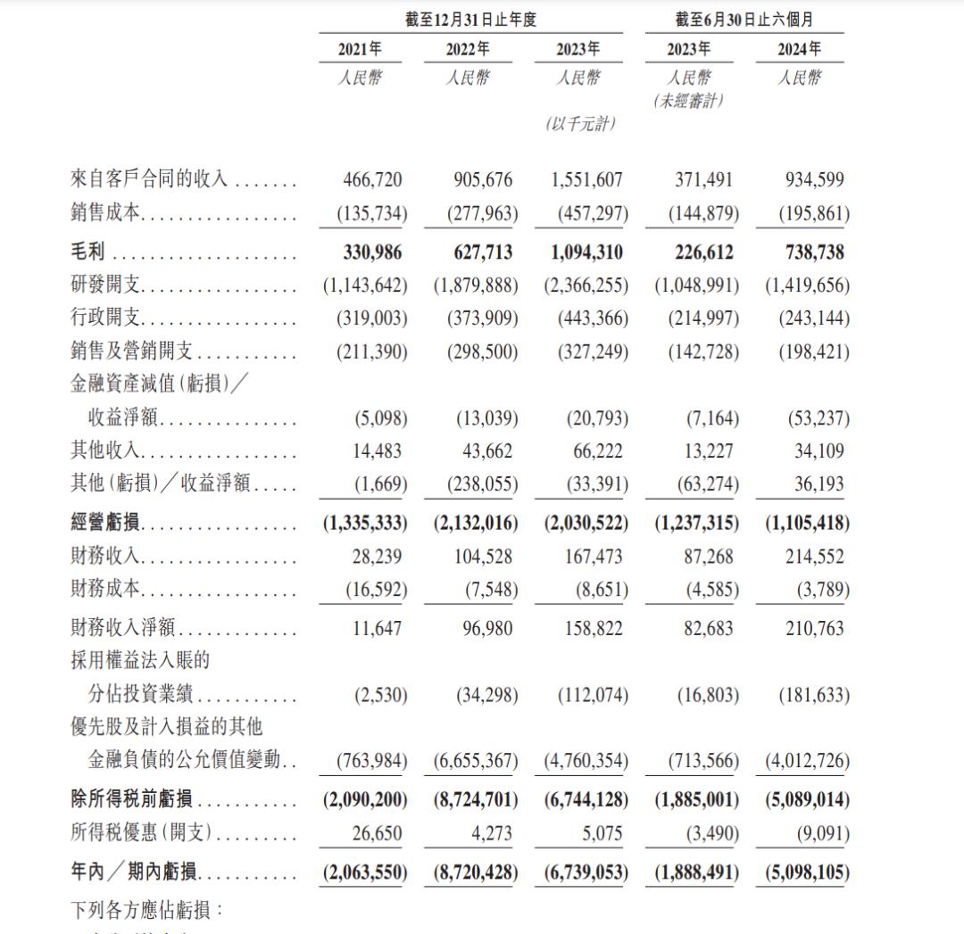 招股书显示,2021年、2022年、2023年及2024年上半年,地平线营业收入分别为4.67亿元、9.06亿元、15.52亿元及9.35亿元;毛利分别是3.31亿元、6.28亿元、10.94亿元及 7.39亿元,毛利率分别为70.9%、69.3%、70.5%及79.0%。