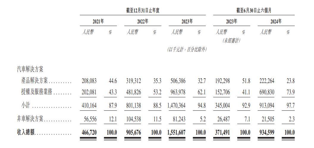 招股书显示,2021年、2022年、2023年及2024年上半年,地平线汽车产品解决方案产生的收入分别为2.08亿元、3.19亿元、5.06亿元及2.22亿元,分别占同期收入总额的44.6%、35.3%、32.7%及23.8%;授权及服务业务产生的收入分别为2.02亿元、4.82亿元、9.64亿元及6.91亿元,分别占同期收入总额的43.3%、53.2%、62.1%及73.9%。