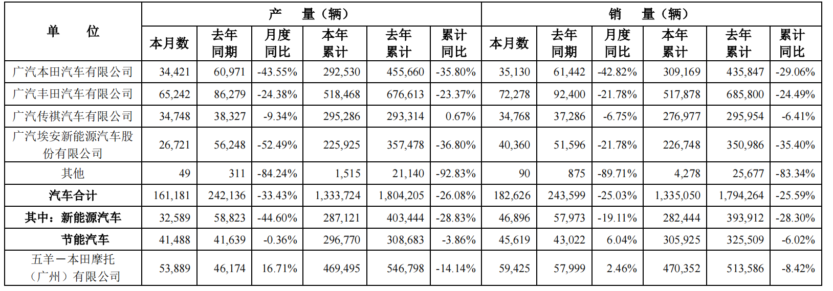 主要投资企业产销数据显示,广汽本田汽车有限公司9月产量为34,421辆,同比下降43.55%;9月销量为35,130辆,同比下降42.82%。