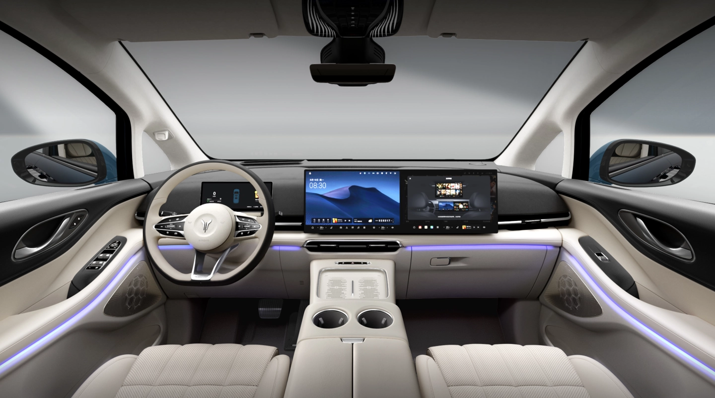 新款梦想家中控、副驾连屏取代了老款三联屏布局,单块屏幕尺寸为 15.4 英寸。配备 10.25 英寸悬浮式全液晶仪表和 29 英寸 AR-HUD 抬头显示,提供 2 个 50 瓦手机无线充电面板。