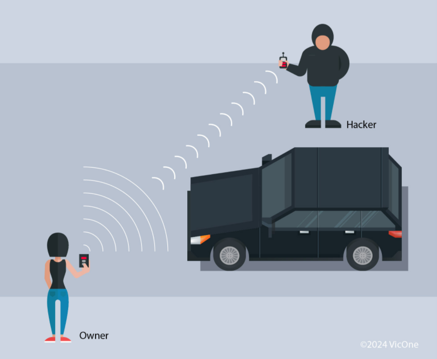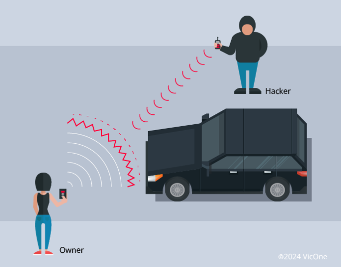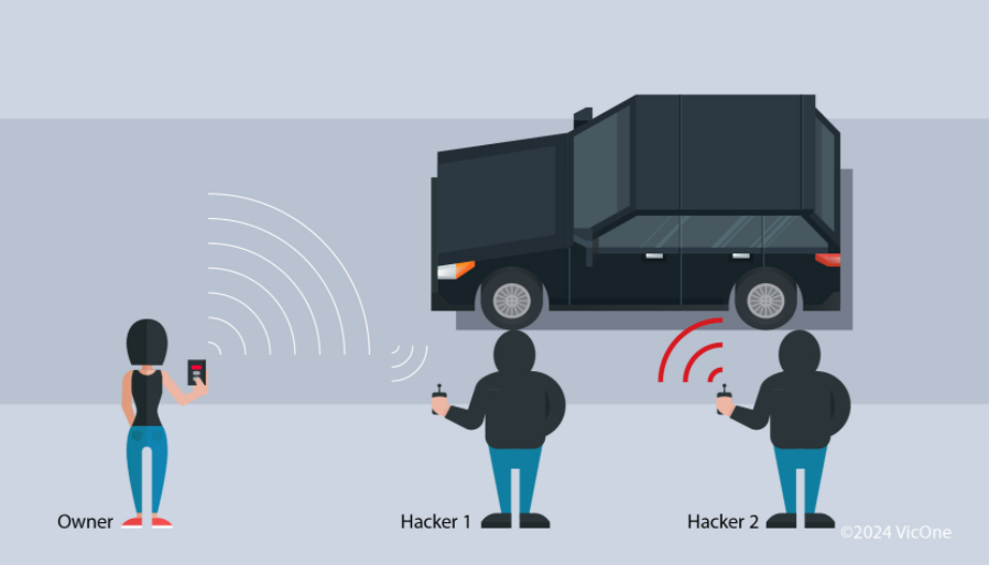 在重放攻击中,黑客拦截车主发送的信号。他们能够使用捕获的固定代码信号获得对车辆的未经授权的访问。