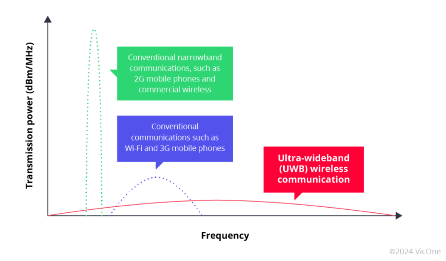 传统窄带通信(例如 2G 移动电话)和传统通信(例如 Wi-Fi 和 3G 移动电话)在较窄的频带上以较高的功率水平运行。UWB 无线通信涵盖很宽的频率范围,但传输功率明显较低。