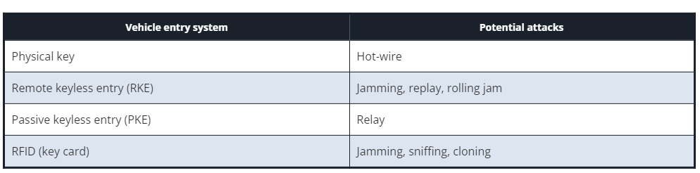 这些攻击已被证明可以有效绕过上一节讨论的车辆进入系统。下表总结了车辆进入系统的各种迭代以及可以对它们使用的不同攻击方法。