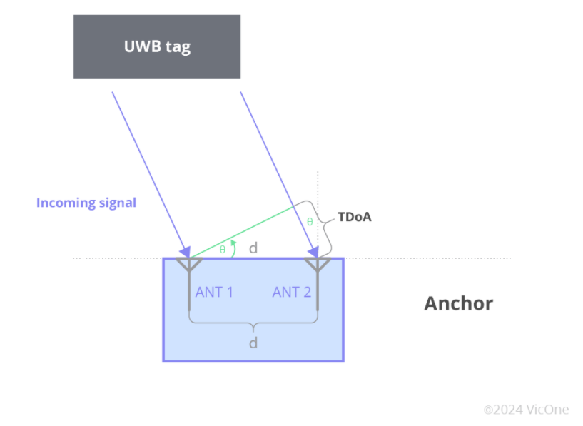 在 PDoA 或 AoA 方法中,标签发送信号,该信号由锚点上的多个天线接收。通过获取不同天线上相同信号的相位差并了解天线之间的距离,可以准确计算标签的位置。