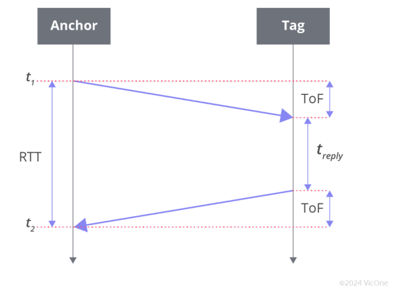 TWR 方法改进了 ToF 方法,消除了锚点和标签之间同步的需要,仅依赖于来自一个设备的时间戳。锚点发送标签在传播时间或 ToF 之后收到的消息。然后,标签在固定的回复时间(包含在数据包中)后做出响应。然后,锚点可以使用已知的回复时间根据往返时间(RTT)计算 ToF。