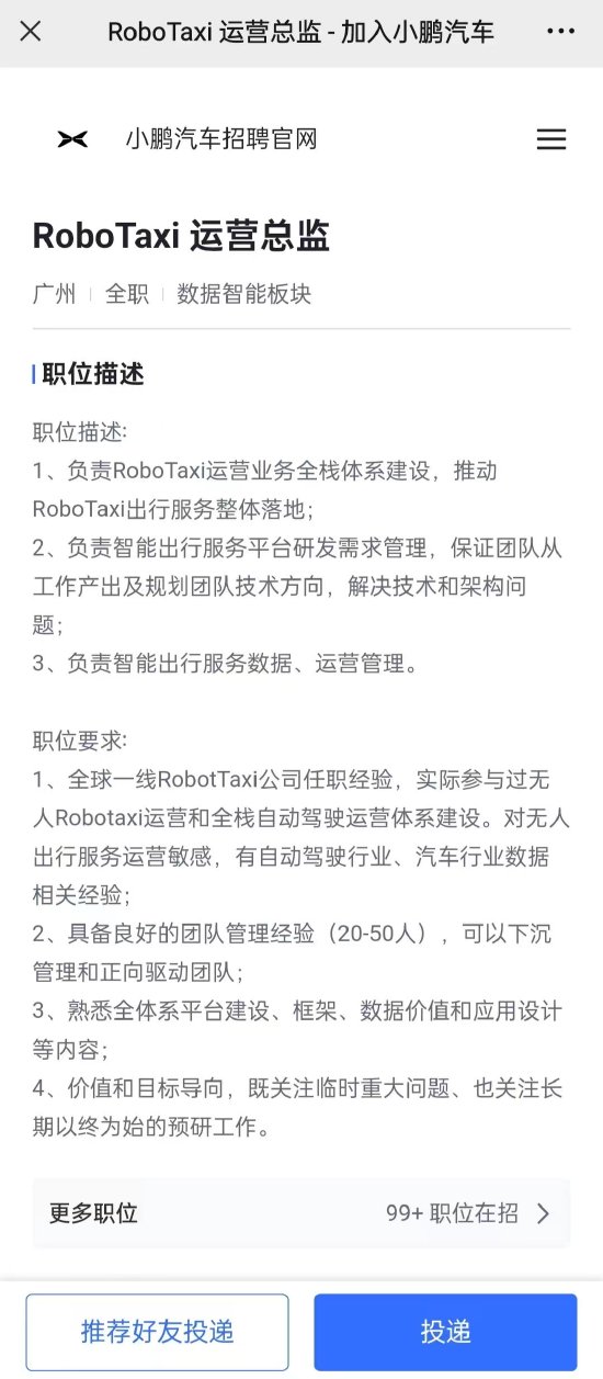 10 月 10 日早间消息,新浪科技独家获悉,小鹏汽车正在加码 Robotaxi 团队,高薪招聘有全球一线 Robotaxi 从业经验的员工,岗位包括运营总监、运营高级经理。