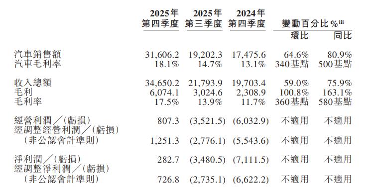 这也让蔚来2025年第四季度的经营利润达到了人民币8.073亿元,经调整的经营利润(非公认会计准则)为人民币12.513亿元,即便是最难达成的净利润也来到了2.827亿元,去年同期还是亏损71.115亿。