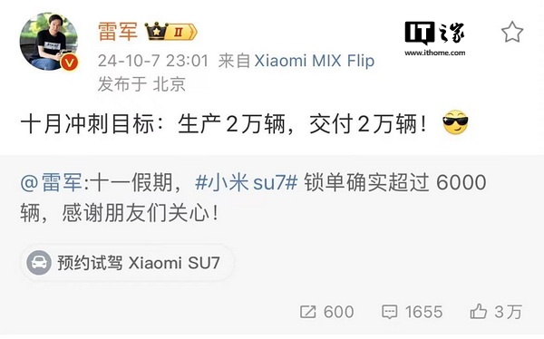 在刚刚过去的国庆假期,雷军通过社交媒体表示,十一假期小米 SU7 锁单超过 6000 台。同时雷军还在社交媒体上公布了 10 月份的目标,生产 2 万辆,交付 2 万辆。而刚刚过去的 9 月份,小米汽车交付量超过 1 万台。